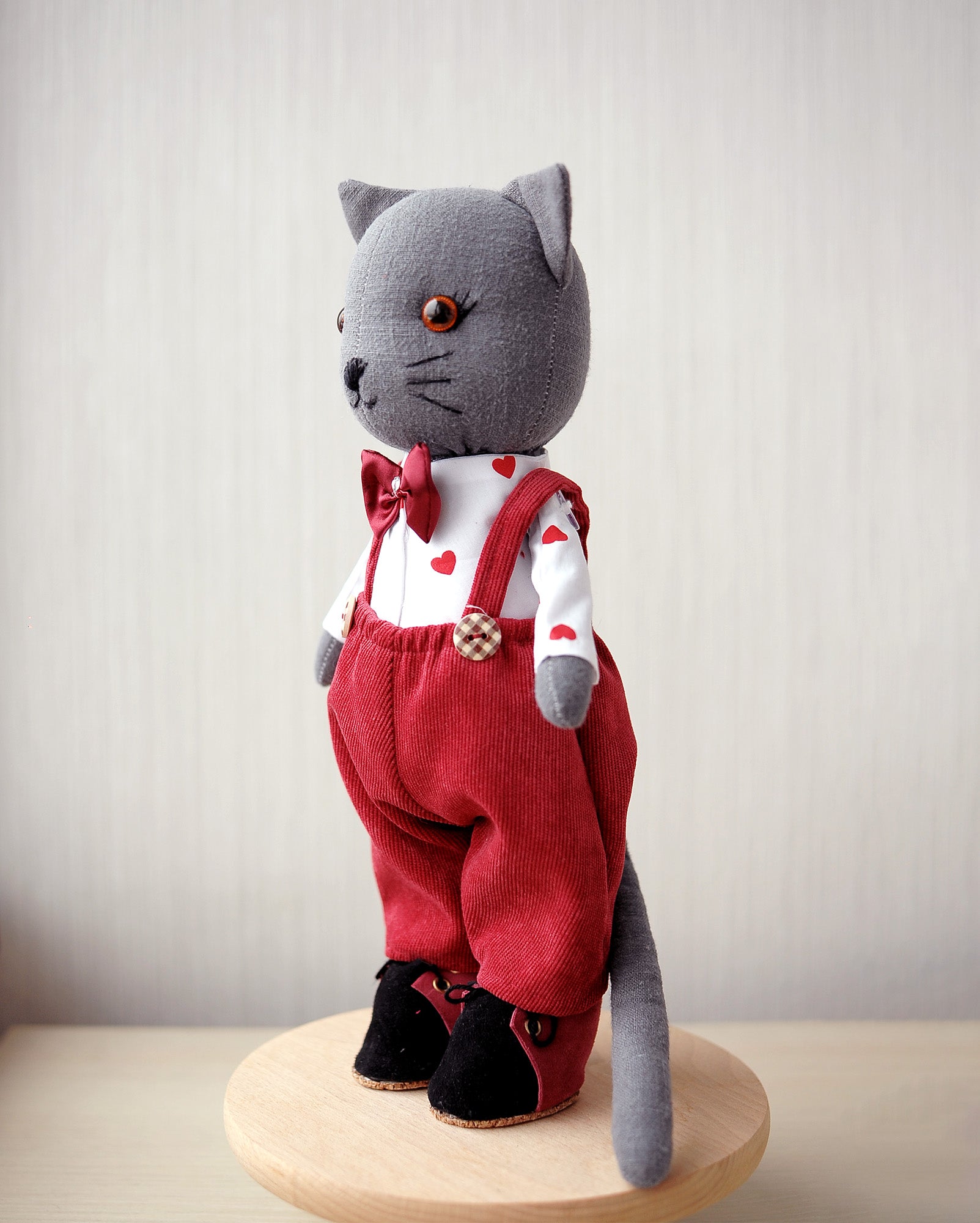 This grey British-style cat is a lovingly handmade textile doll, created with great attention to detail and fine craftsmanship. With its gentle expression and elegant red outfit, this doll has a warm, charming personality that makes it truly special.