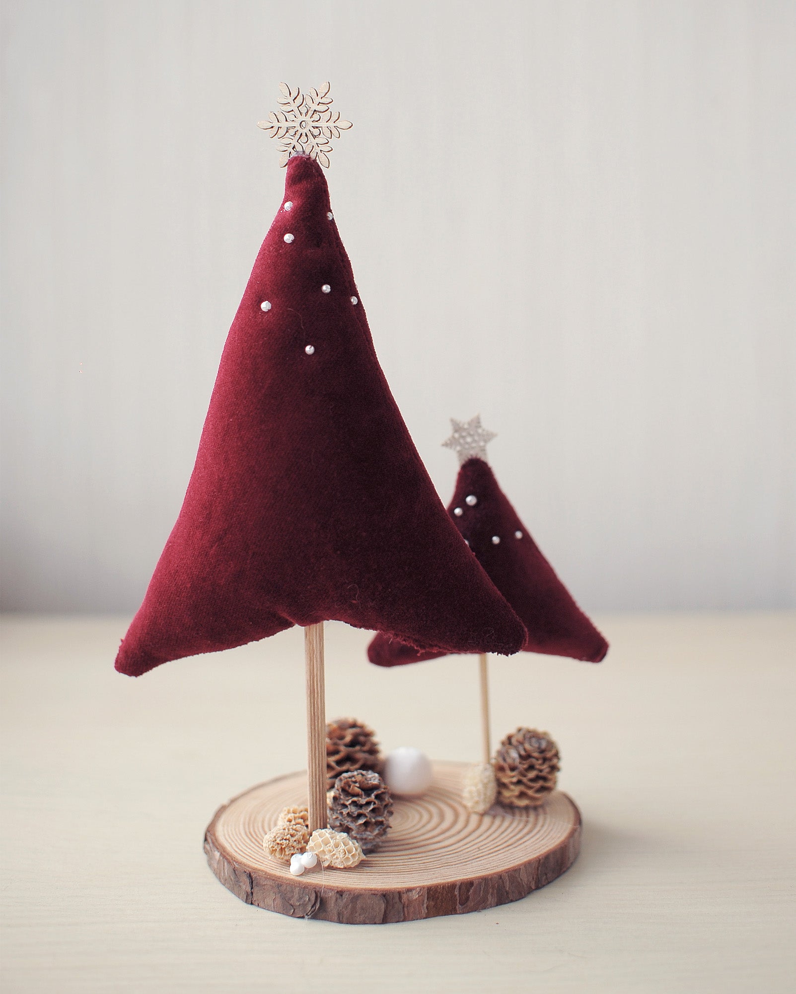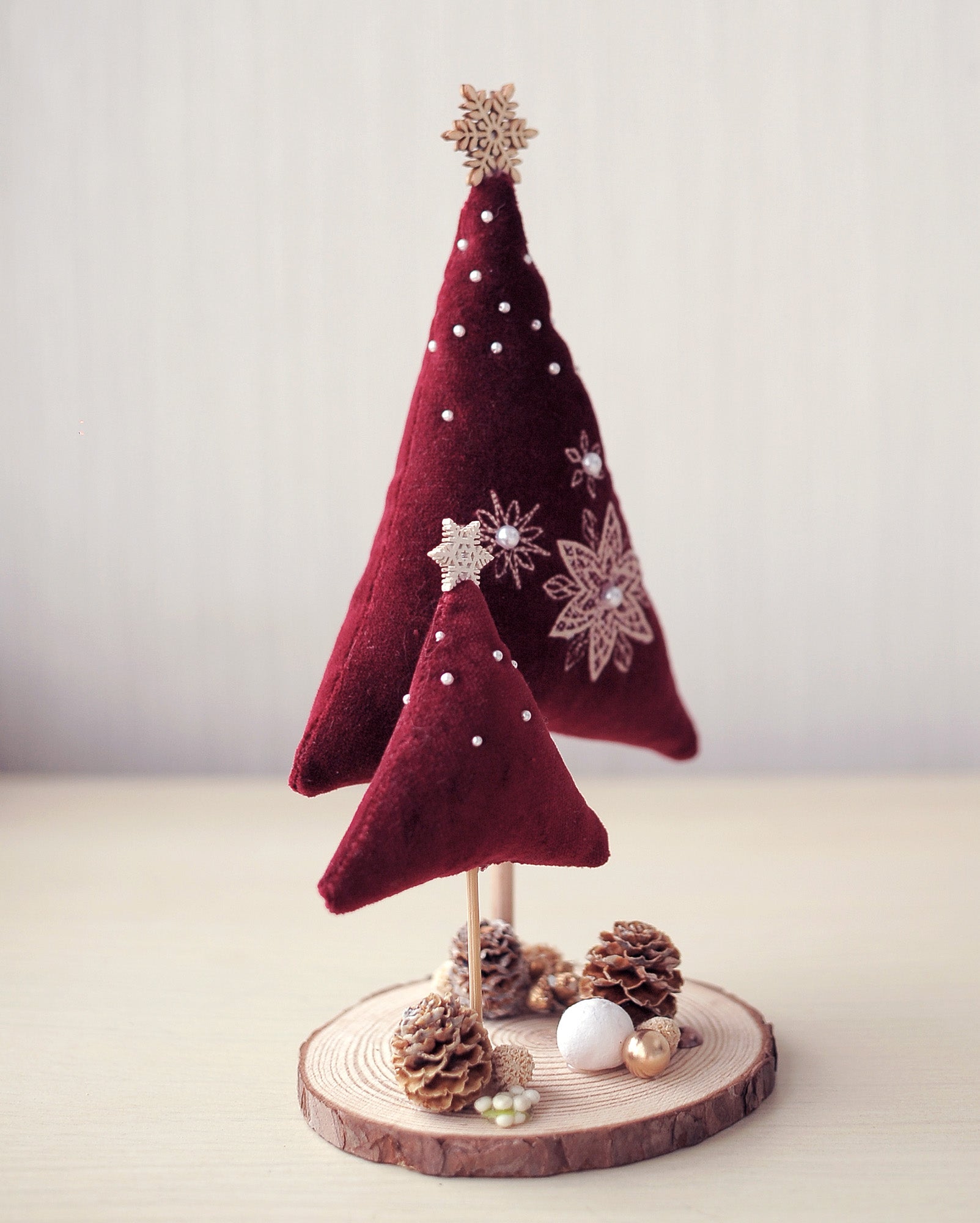 Add a touch of warmth and elegance to your holiday décor with this unique handmade Christmas table ornament. Featuring two soft velvet Christmas trees in rich burgundy tones, each tree is beautifully embellished with tiny pearl-like beads for a festive sparkle. The big tree is decorated with a delicate snowflake embroidery.