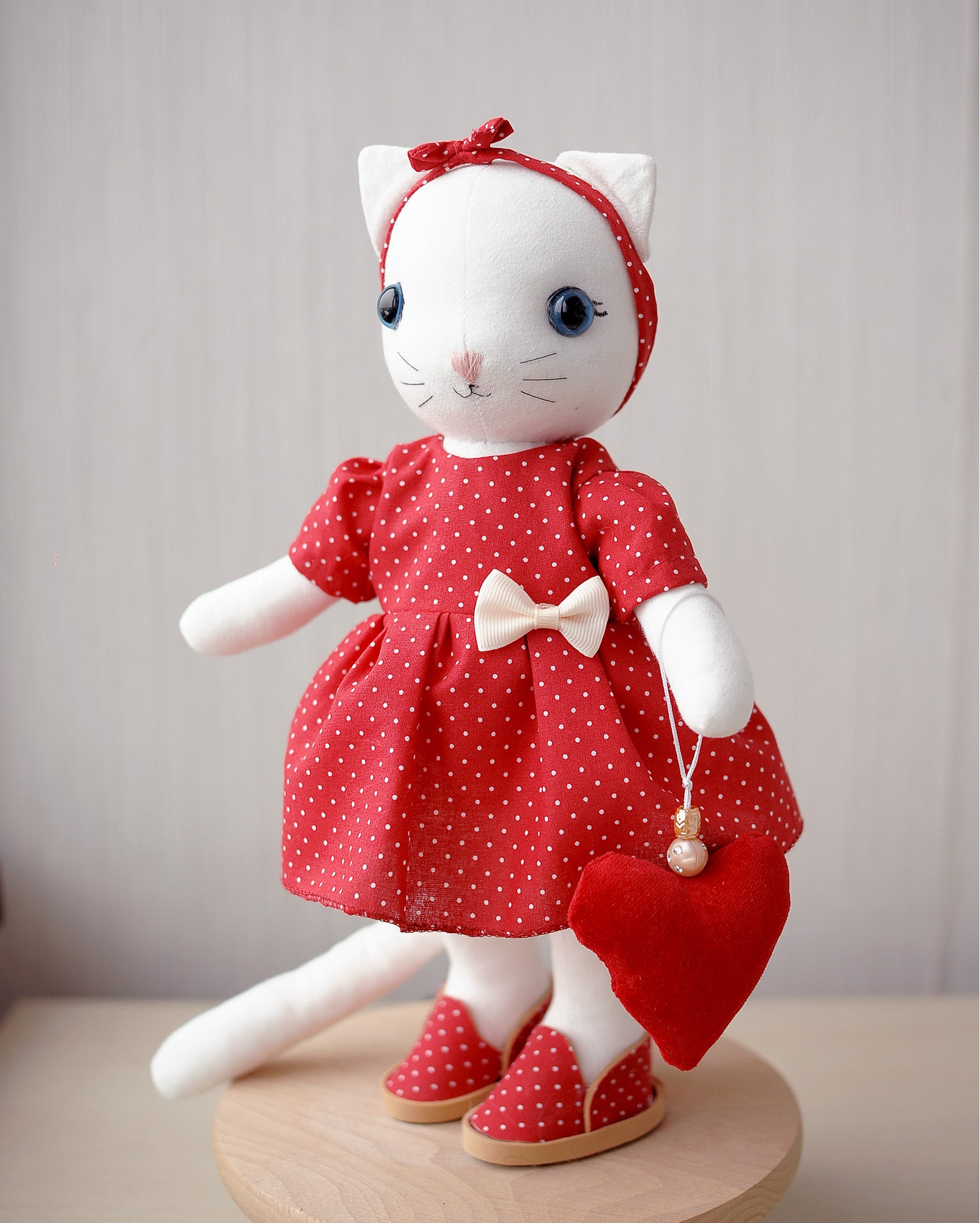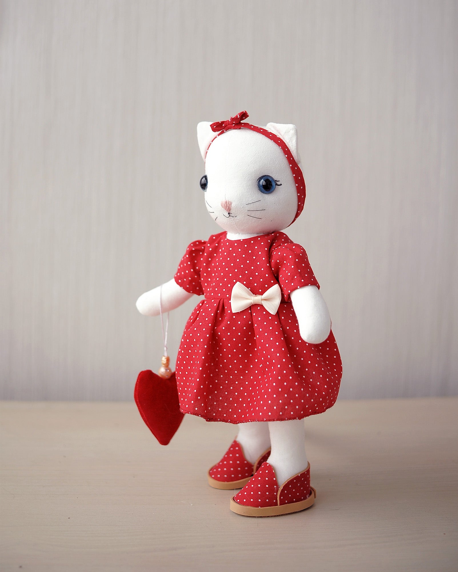 This white cat textile doll is a delicate handmade creation, carefully crafted with love and attention to every detail. With her sweet expression, blue eyes, and charming red polka-dot dress, this doll brings a cozy, romantic feeling inspired by Valentine’s Day. She also carries a little heart shaped velvet accessory.