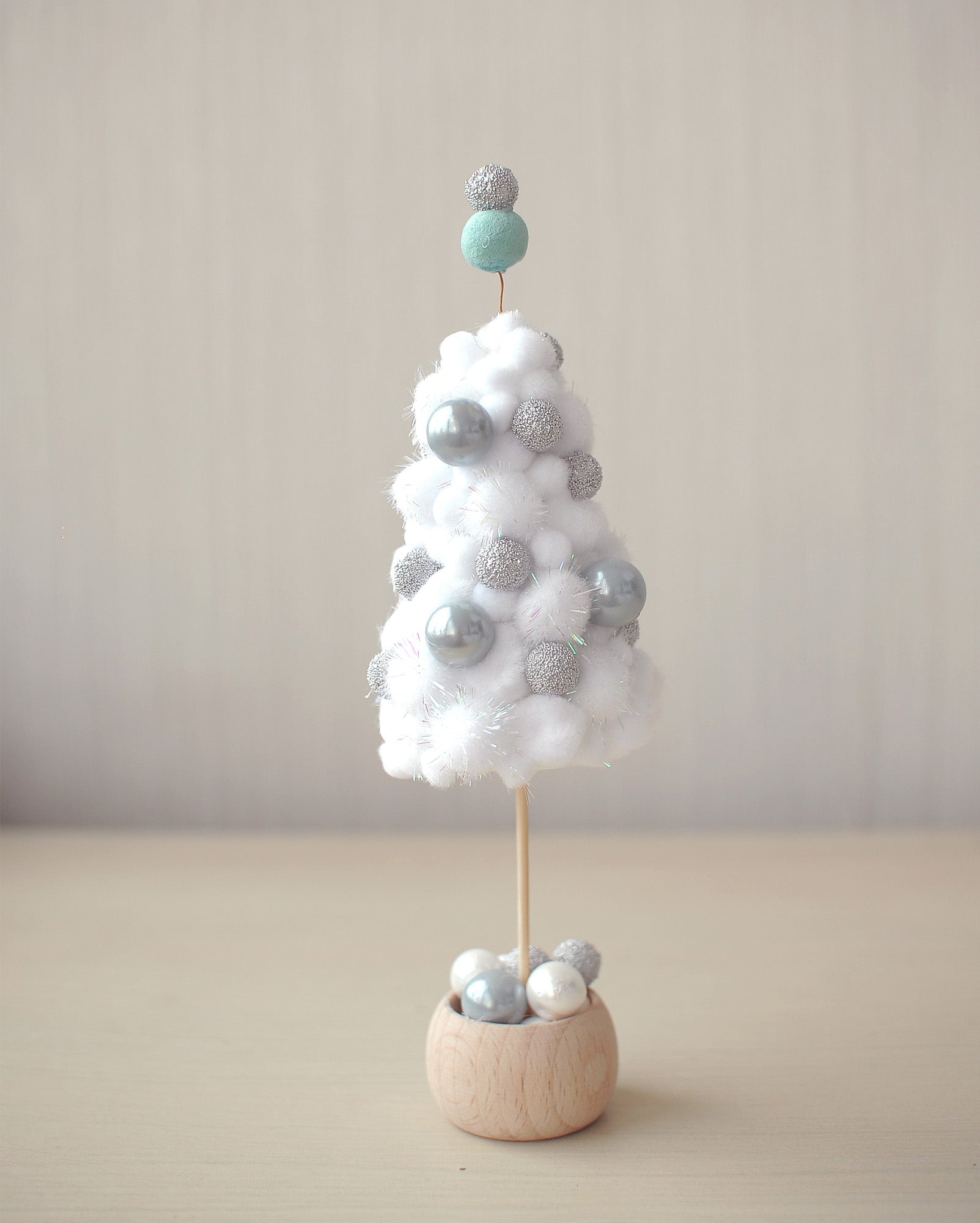 Bring a touch of winter elegance into your home with this delicate handmade tabletop Christmas tree. Crafted from fluffy white pom-poms, the tree has a soft, snowy texture and is adorned with shimmering silver accents and glossy pastel blue baubles for a modern, frosty look.